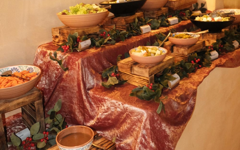 All guests are invited to enjoy a luxurious 5-star buffet dinner, offering a delicious variety of international and Arabian cuisine over multiple courses. Our skilled chefs prepare all dishes on site with high-quality fresh ingredients. There are meat and vegetarian options available in every course, with the buffet menu including entrees, salads, soups, mains and desserts. See the menu.