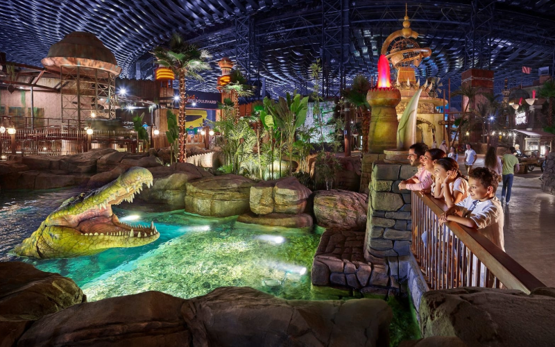 Two of the five zones represent renowned global brands Cartoon Network and Marvel, while The Haunted Hotel, IMG Boulevard and the Lost Valley β Dinosaur Adventure zones are original concepts created by the IMG Group. IMG Worlds of Adventure is the largest temperature-controlled indoor themed entertainment destination in the world, covering an area in excess of 1.5 million square feet.